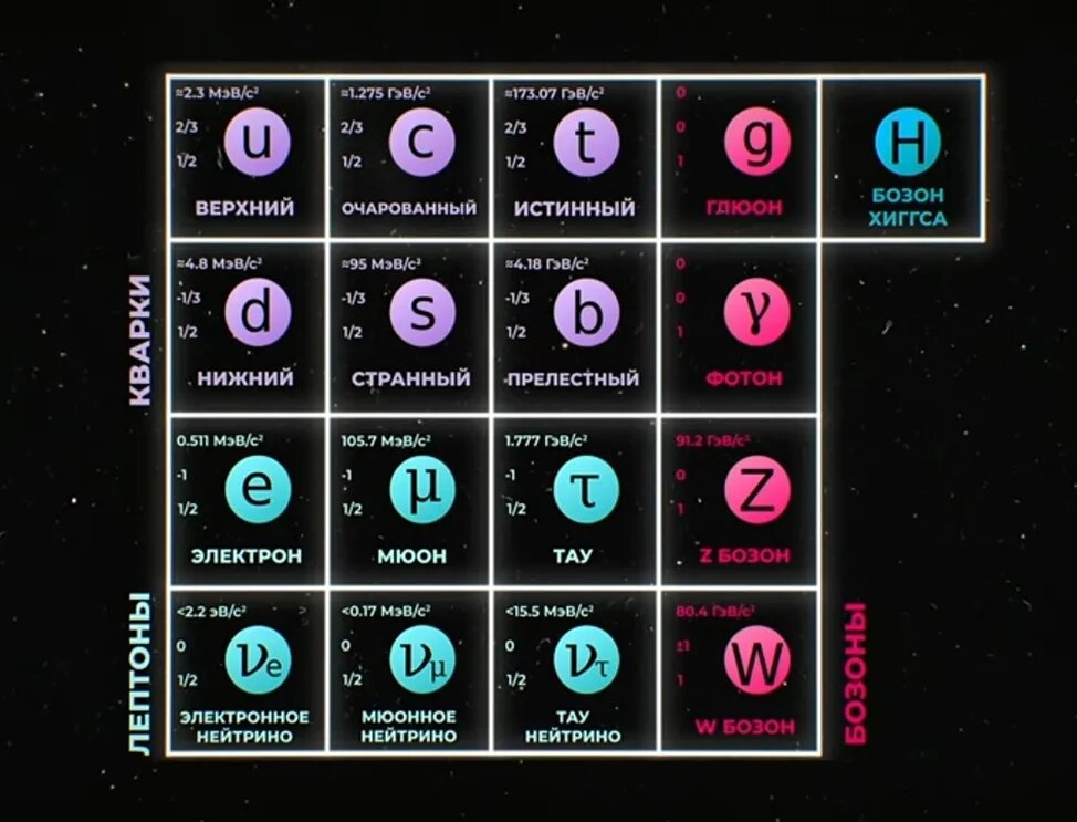 Фундаментальные элементарные частицы делятся на три типа: лептоны, кварки, бозоны.