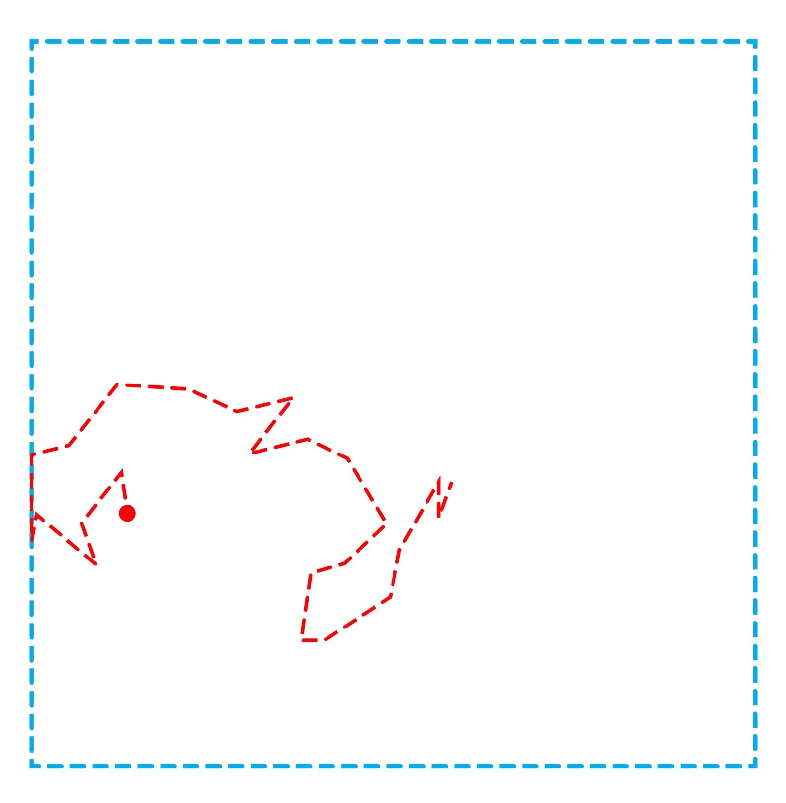 Задача эквивалентна визуализации проекции на плоскость процесса броуновского движения малого пробного тела в результате случайных столкновений с молекулами среды. В данном случае задан модуль интервала перемещения ( от - x до + x ). При каждом единичном перемещении по прямой, длина этого перемещения является случайной величиной и может составлять от d = 0 и до d = 2x, при этом есть вероятность и движения в противоположном направлении после того, как выполнено движение в прямом направлении. Помимо этого, изменение угла направления по сравнению с предыдущим направлением, является случайной величиной и охватывает весь спектр угловых изменений от 0 и до 360 градусов. На представленном рисунке число перемещений от начальной точки ( окрашенный круг ) : n = 25. Для удобства интервалы единичных перемещений обозначены пунктирами.