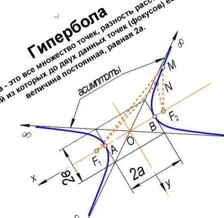Я нашел много описаний частного случая гиперболы, где фокусы лежат параллельно оси X. Кроме того все расчеты базируются на знании коэффициента a и b ? Но мне известны только координаты двух фокусов и один дополнительный параметр - разница катетов от точки M до фокусов. Уже заметил экспериментально, что возможны два варианта когда разница катетов может быть в пределах ширины между фокусами и когда больше. Это получается уже другая кривая... Нужен алгоритм для решения в координатах, в самом общем виде.