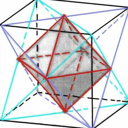 Можно сделать пространственный «крест» из 6 «карандашей» - длинных тонких параллелепипедов, примыкающих снаружи к граням единичного куба (куб нужен только для объяснения конструкции). Карандаши лежат по одному на гранях куба симметрично относительно центра куба, причем центр грани карандаша совпадает с центром одной из граней куба.