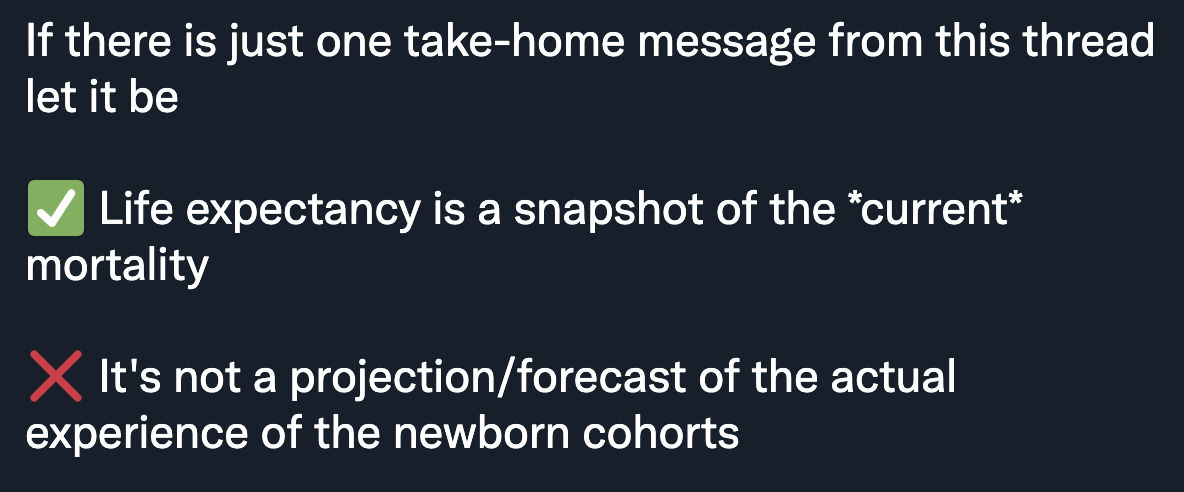 А вот про ожидаемую продолжительность жизни расскажу. Этот показатель крайне неудачно назван. Он неудачно назван ещё в английском life expectancy, а при переводе ещё наслаиваются потенциальные заблуждения. Expectancy в названии происходит не от ожидания некого будущего, а от статистического expected value [1]. Суть в том, что ожидаемая продолжительность жизни, вопреки своему же названию, очень мало говорит нам о предстоящей продолжительности жизни живущих сейчас людей. Но это замечательный, самый лучший, интегральный показатель текущей смертности населения [2], позволяющий довольно корректно сравнивать смертность как между разными населениями (чаще всего, странами) [3], так и во времени [4].