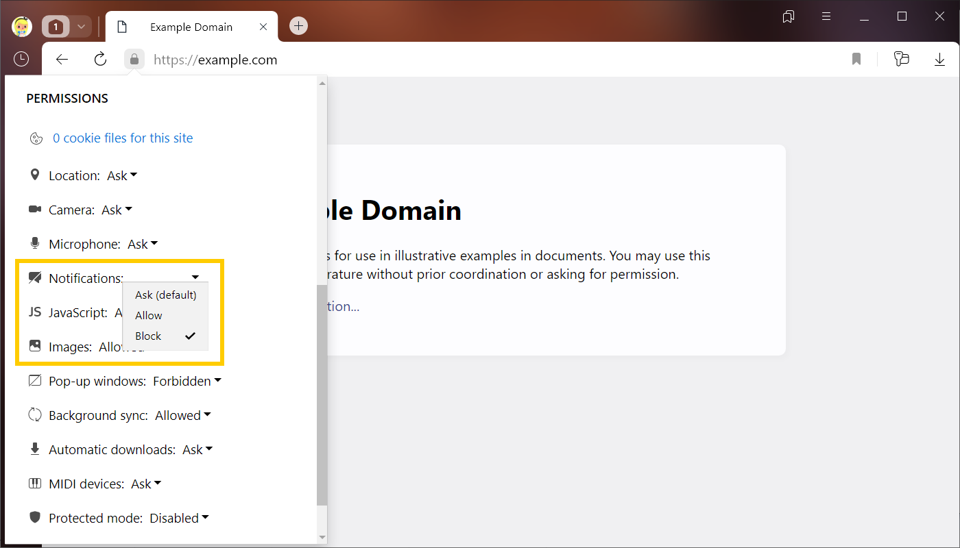 - In the Permissions section, find the JavaScript field and select Block from the list.