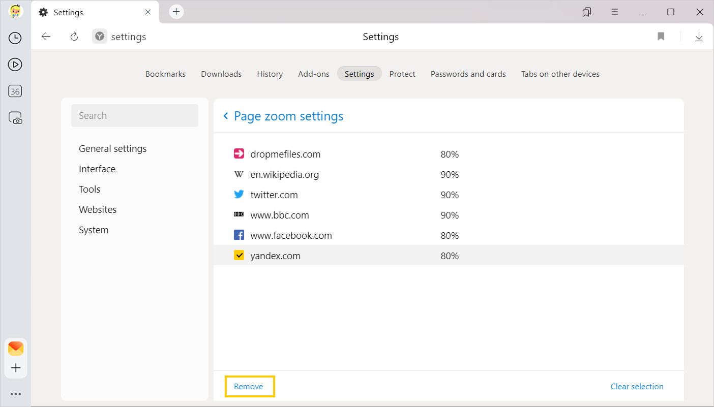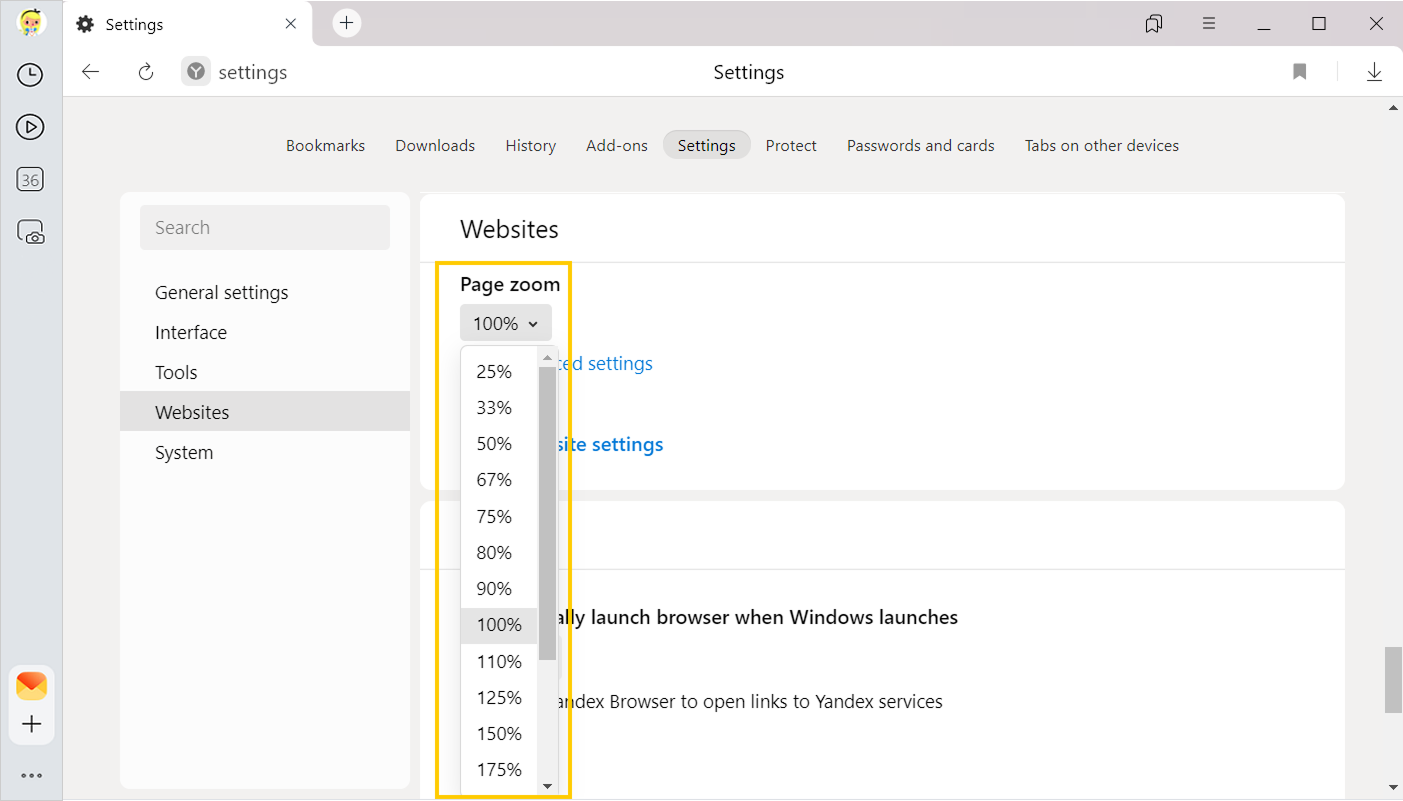 The data about the zoom you set is saved in Yandex Browser. The next time you open the page, it uses your selected zoom level.