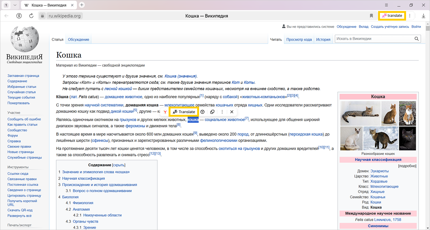 Yandex Browser will prompt you to translate the page if its language is different from your interface language. You can access Yandex Translate or translate specific words, images or videos using the context menu.