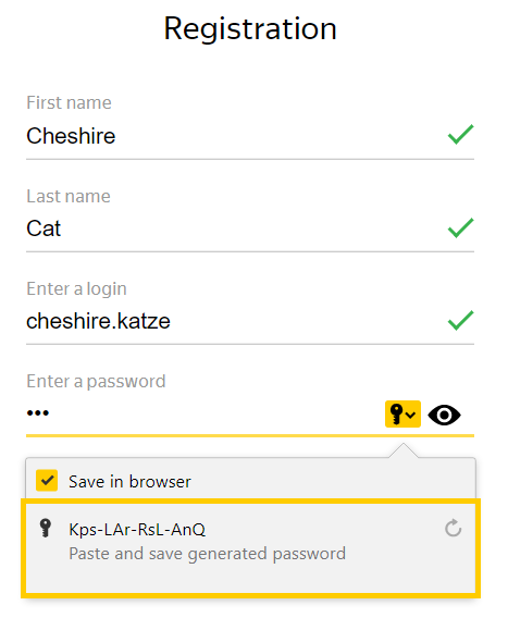 icon that appears. - In the drop-down list, click the generated password. It appears automatically as soon as Yandex Browser recognizes a registration form or a request to change your password.
