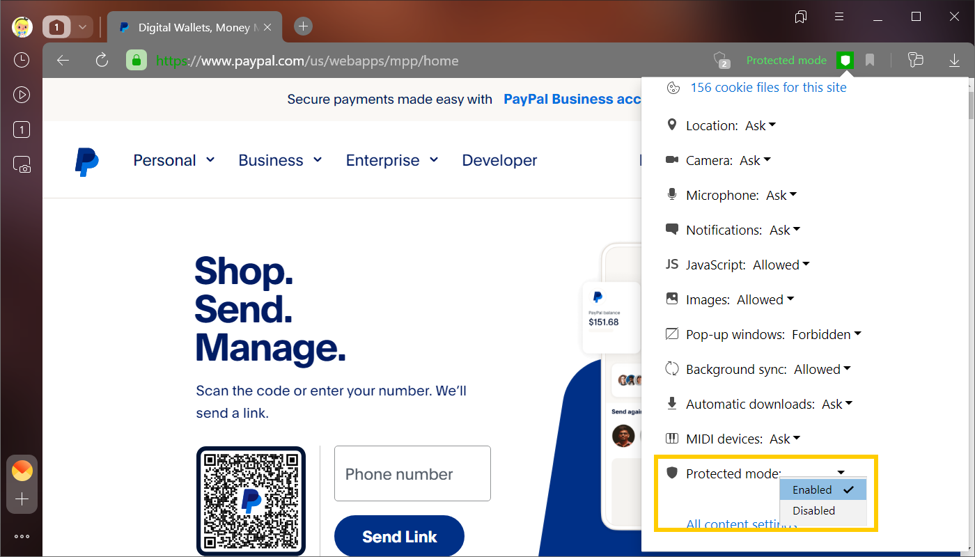 If protected mode is not enabled, there are most likely problems with the site certificate. It’s better not to make payments on this page. We recommend that you open the Protect panel, read the information about using the certificate and assess the risk of theft of your payment information.