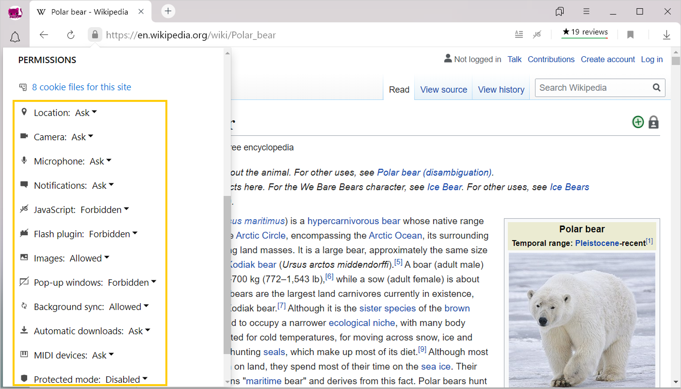 To protect your data, Yandex Browser applies various handling rules to website content. For example, it blocks pop-up windows, warns you when a website requests your location, and so on. If Yandex Browser rules interfere with how you use a website, you can set an exception for this site. For example, you can apply exceptions if you don't want Yandex Browser to warn you every time Yandex Maps requests your location. Or enhance security on a specific website by not allowing the site to run JavaScript.