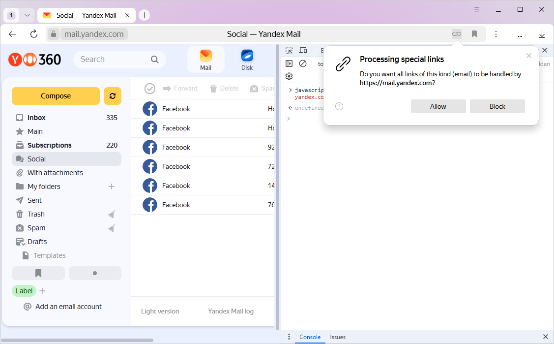 icon displayed to the right of the SmartBox, use the JavaScript console to assign Yandex Mail as the mailto handler: