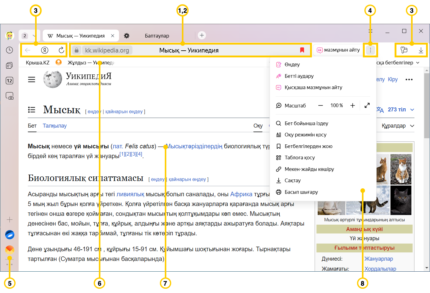 Екінші деңгейде Артқа, Яндекске өту , Парақшаны жаңарту, Парақшаның мәзірі, Құпиясөздер менеджері , Жүктеулер және т.б. батырмалардың арасында ауысып отыра аласыз.