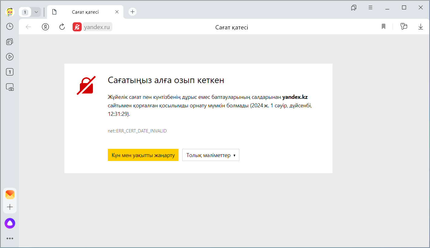 Сайтпен жұмысты жалғастыру үшін, Күн мен уақытты жаңарту батырмасын ьасыңыз. Ашылған жүйелік баптауларда дұрыс күні мен уақытын орнатыңыз, содан кейін Браузердегі бетті жаңартыңыз.