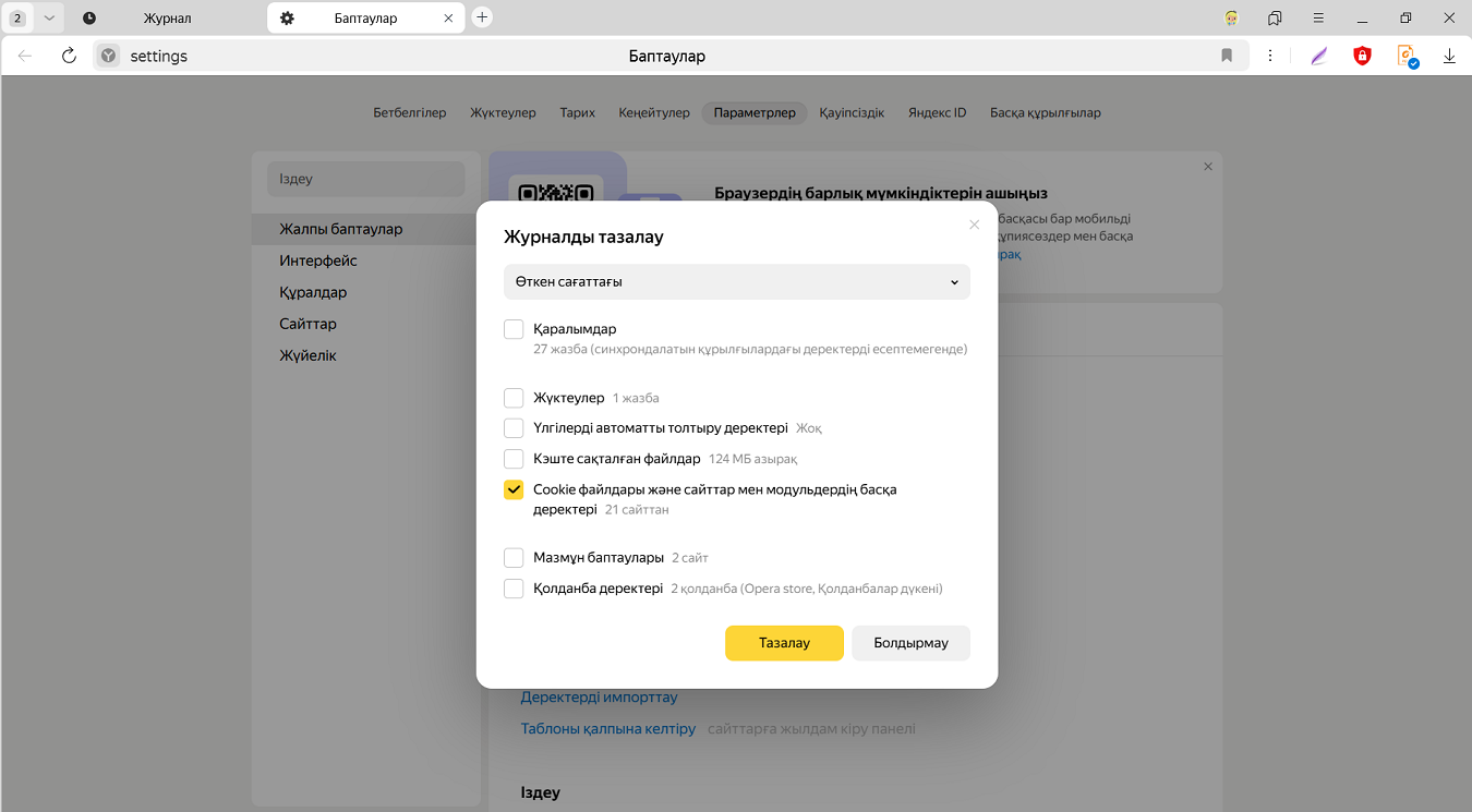 Cookie файлдары және басқа сайттар мен модульдер деректері тармағын таңдаңыз (тек cookie файлдарын жойғыңыз келсе, қалған опцияларды өшіріңіз).