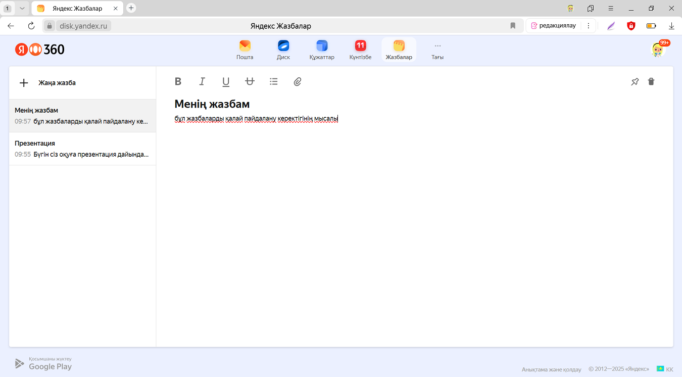 Яндекс Ескертпелер — идеяларды, пайдалы сілтемелерді, істер мен сатып алулар тізімін және басқа да маңызды ақпаратты бір жерде сақтауға мүмкіндік беретін веб-қолданба.