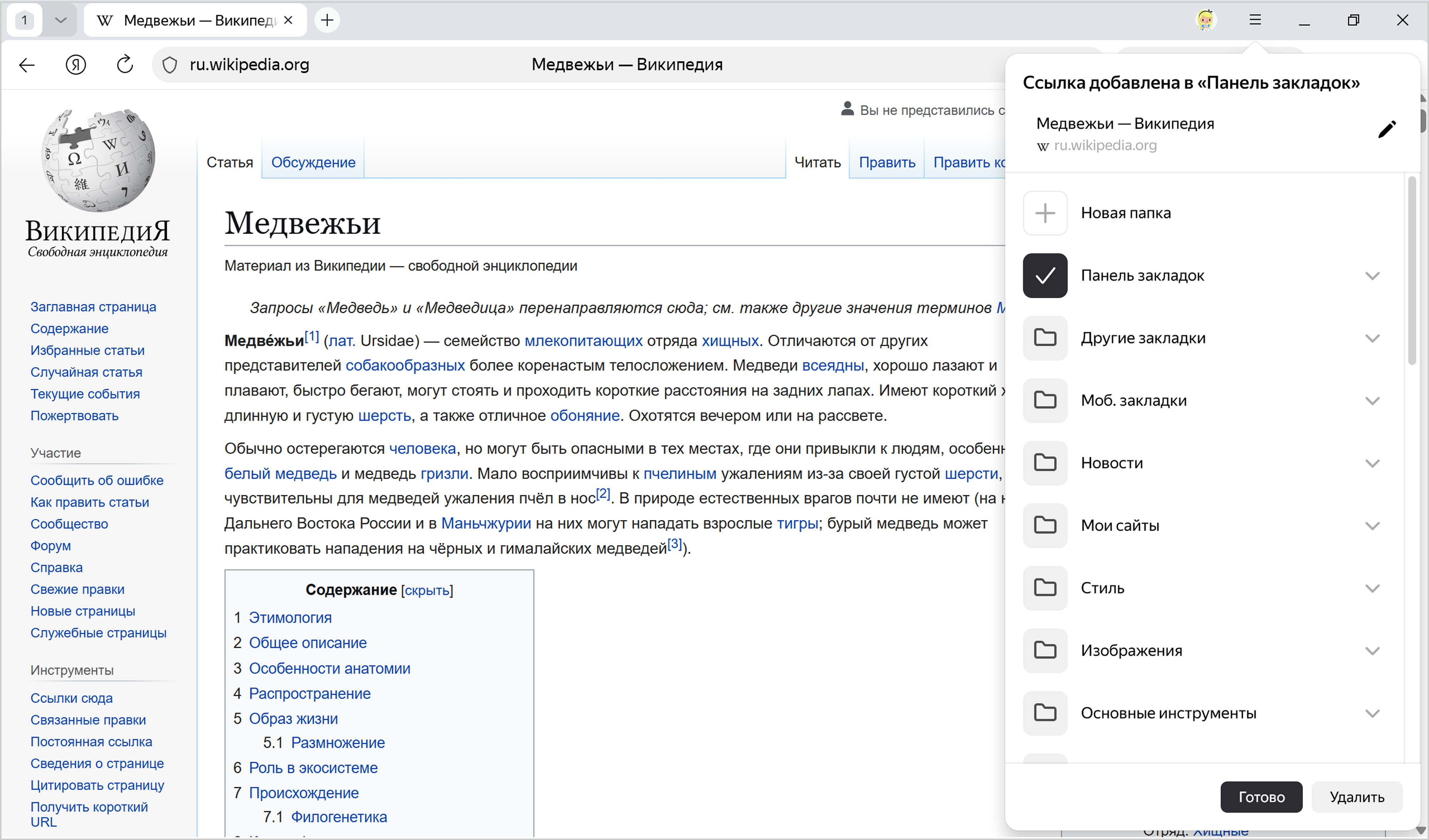 Если вы хотите изменить закладку, нажмите Сохранено в закладки. Откроется панель закладок.