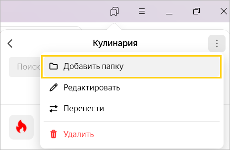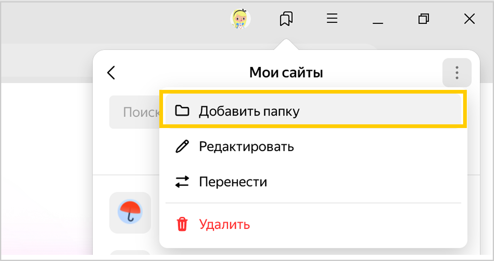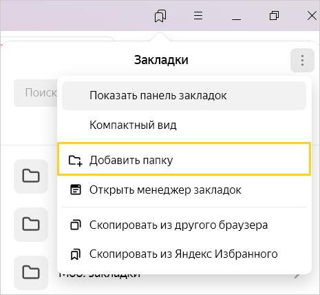 Если вы импортировали закладки из другого браузера, то перенесенные папки также появятся в левом меню. При этом названия папок останутся прежними. Подробнее см. раздел Импорт закладок.