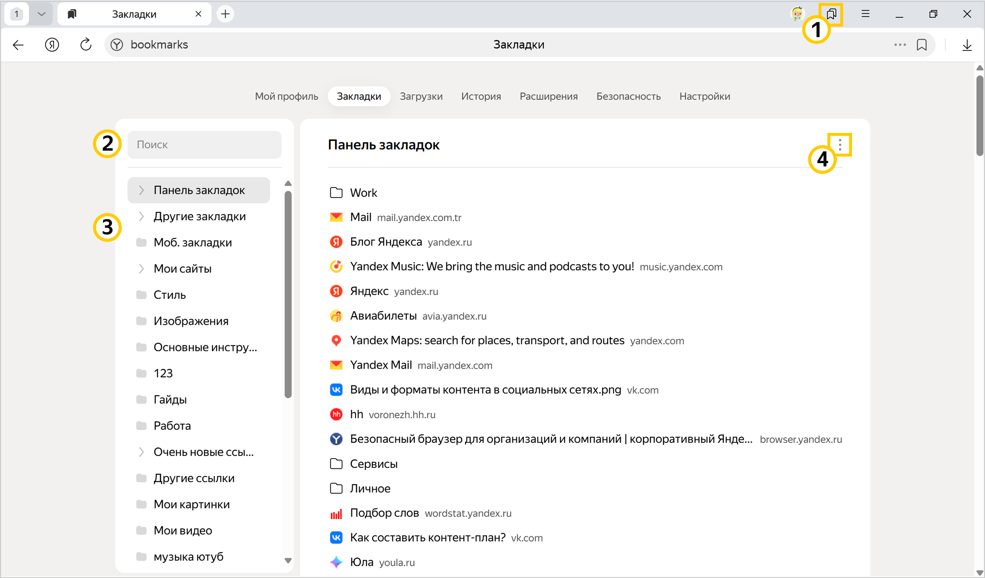Чтобы увидеть все свои закладки, перейдите в менеджер закладок: нажмите значок . Справа от Закладки нажмите → Открыть менеджер закладок.