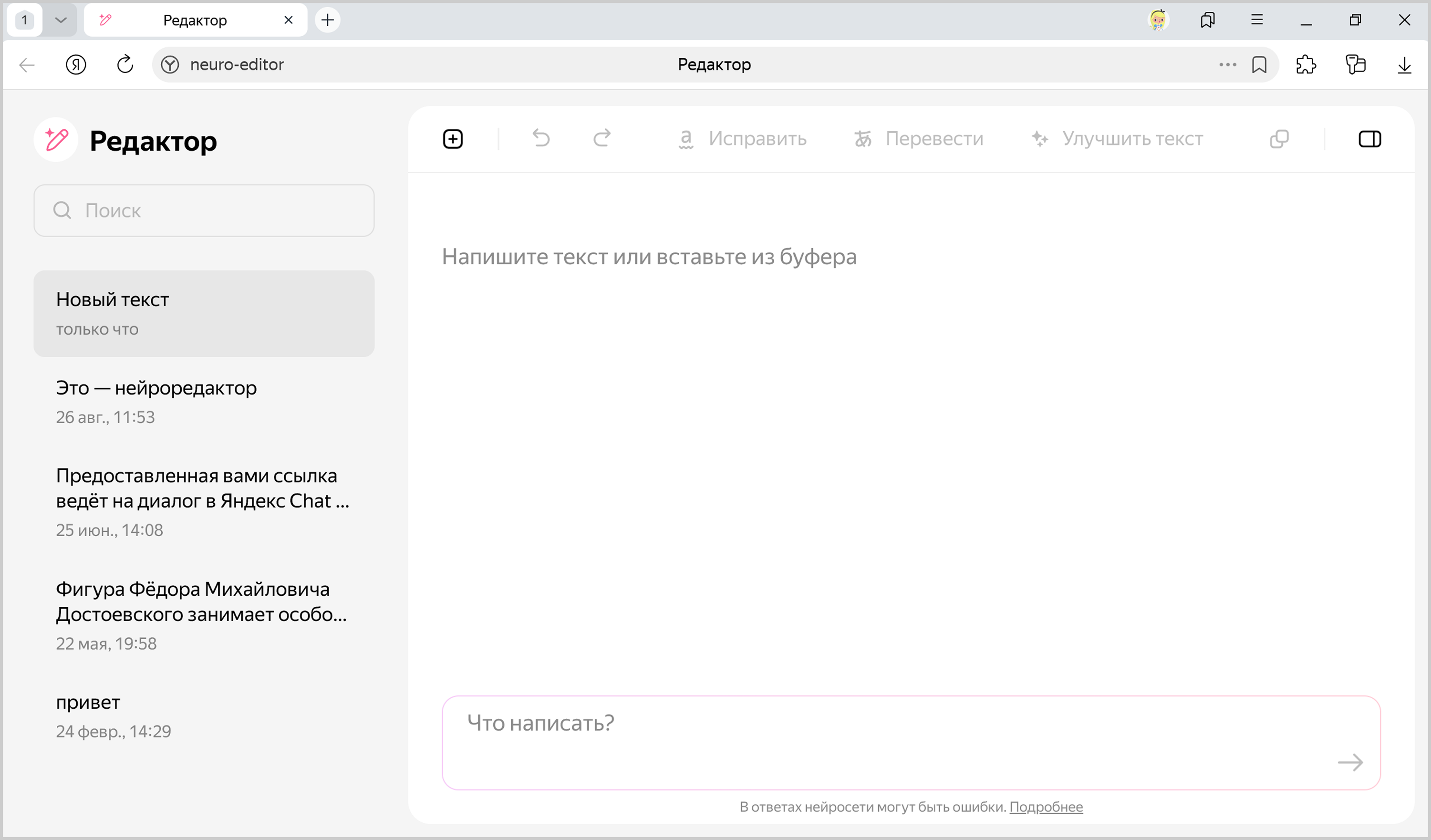 Редактор в Браузере помогает написать, отредактировать и улучшить текст, используя Алису AI. Он исправит ошибки, улучшит стиль, переформулирует или переведет текст на другой язык. Это удобно при подготовке любых текстов: от электронных писем и постов в социальных сетях до научных статей и художественных произведений.