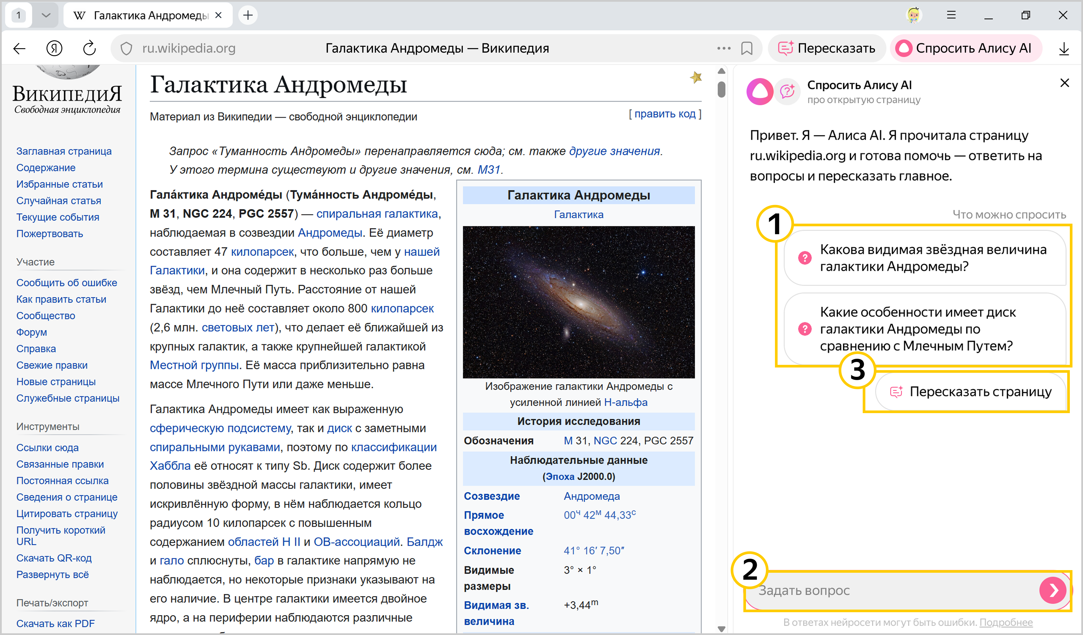 ) Нажмите на один из предложенных Алисой вопросов — они подготовлены с учетом контекста страницы.