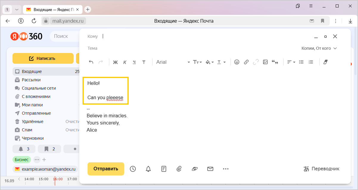 Когда вы вводите текст, Браузер подчеркивает незнакомые слова. Если вы уверены в написании подчеркнутого слова, нажмите на него правой кнопкой мыши и выберите Добавить в словарь.