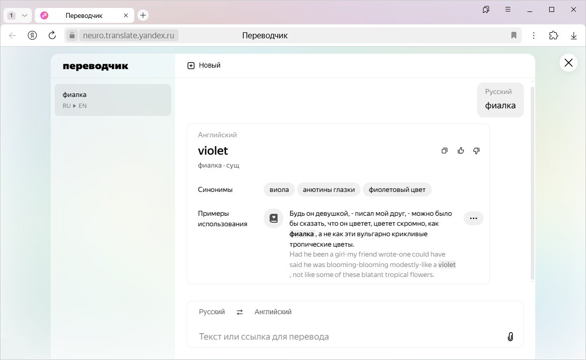 Браузер может переводить на русский язык отдельные слова или предложения на странице. Чтобы увидеть перевод слова или словосочетания, выделите их и нажмите Перевести в контекстном меню. На странице появится окно с переводом.