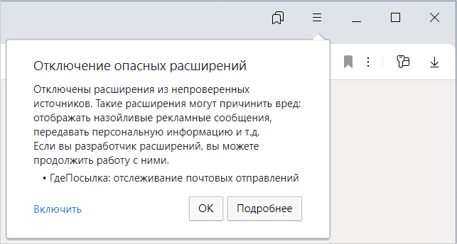 Включайте расширение, только если вы полностью доверяете источнику. Оно может оказаться вредоносным. Браузер блокирует вредоносные расширения, но если оно еще не попало в черный список, ваши данные окажутся под угрозой. Подробнее см. раздел Чем опасны вредоносные расширения.