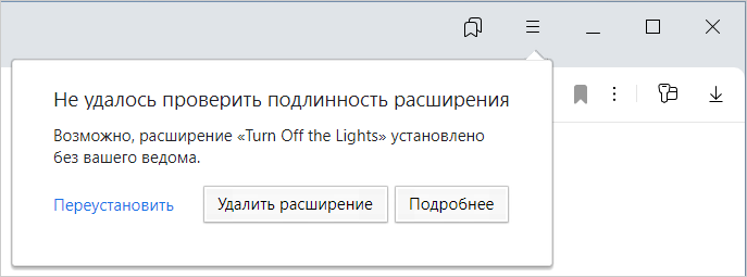 Иногда злоумышленники пытаются подменить установленное из интернет-магазина расширение на вредоносное. Браузер периодически сравнивает установленные расширения с их оригиналами из интернет-магазина (сравниваются хеши исходных файлов). Если расширение не совпадает с оригиналом, Браузер отключает его и предупреждает вас об этом.
