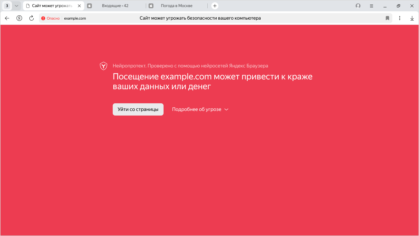 Яндекс отслеживает фишинговые сайты и ресурсы, которые, возможно, используют мошенники. Адреса таких сайтов хранятся в специальной базе данных. Если вы пытаетесь зайти на сайт, который может быть связан с интернет-мошенничеством, Яндекс Браузер заблокирует потенциально опасную страницу и проинформирует вас об этом: в окне Браузера появится сообщение, а в Умной строке — значок  .