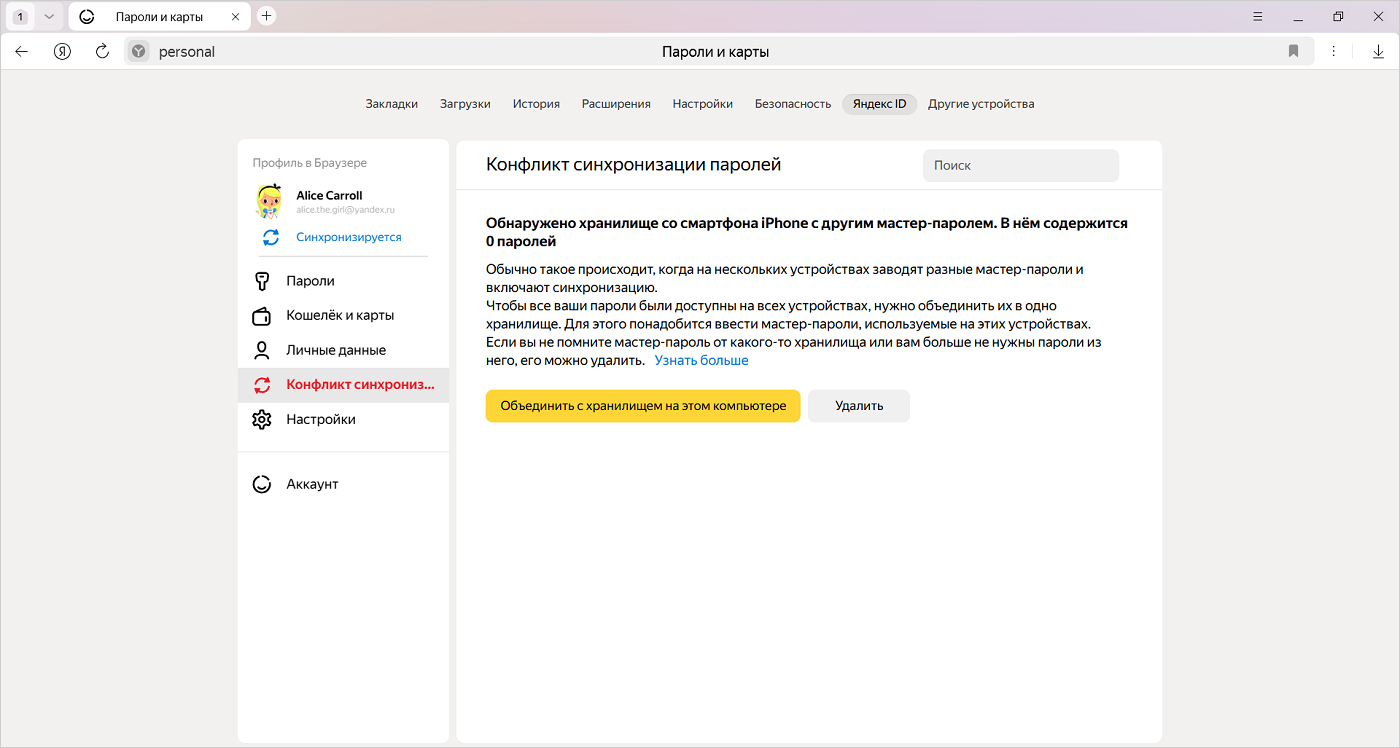 Если вы меняете мастер-пароль или создаете разные мастер-пароли на устройстве с отключенной опцией передачи паролей, возникнет конфликт. Например, вы ввели один мастер-пароль на смартфоне, который передает пароли, а другой — на компьютере, на котором эта опция отключена. Затем вы включили на компьютере передачу паролей. В этом случае Браузер не может понять, какой из мастер-паролей нужно использовать для шифрования объединенного хранилища.