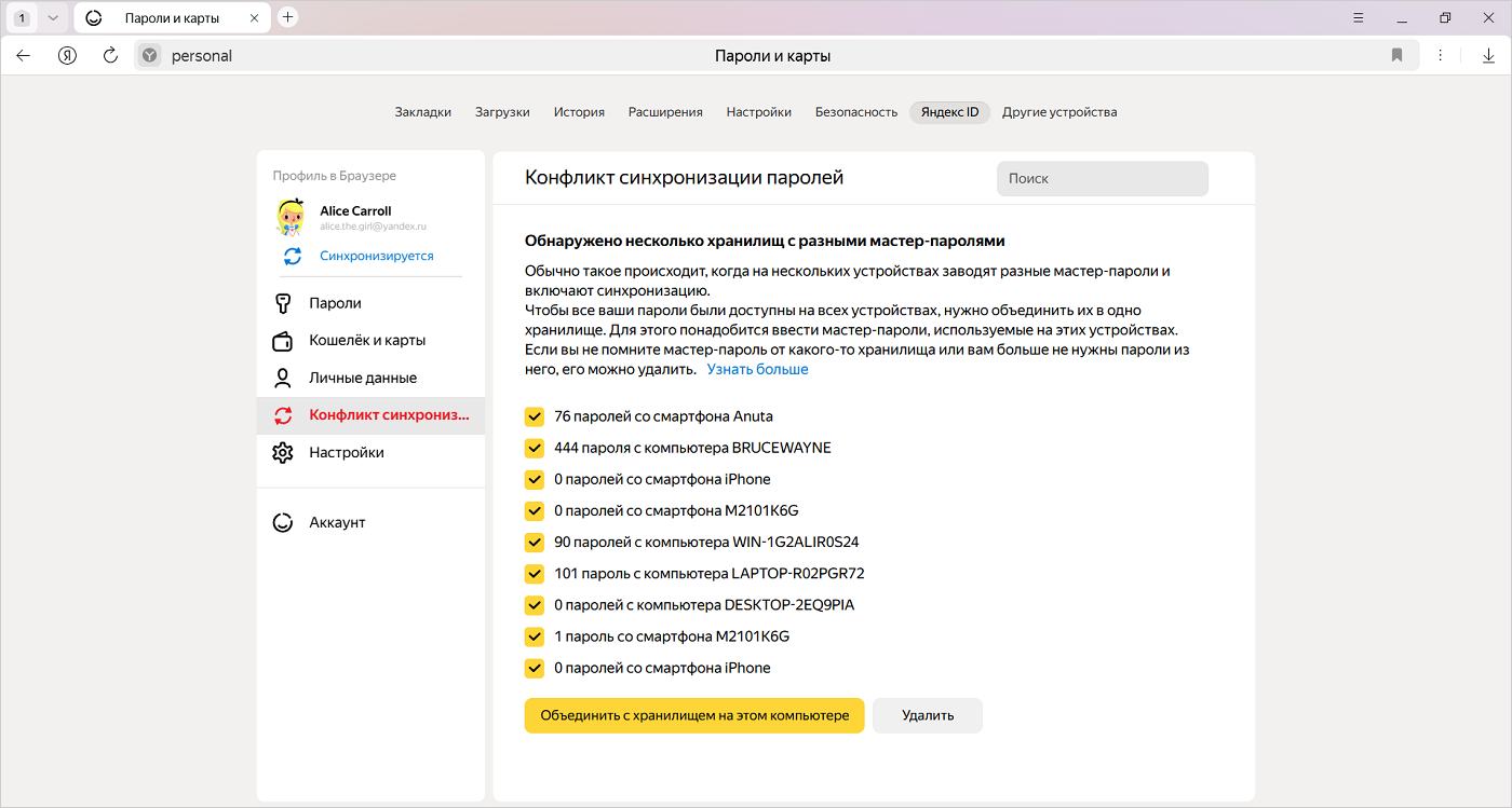 После этого Браузер перешифрует пароли с других устройств, используя мастер-пароль для текущего компьютера. Мастер-пароли для других устройств станут недействительными. Пароли с текущего компьютера попадут в объединенное хранилище. Вы не помните мастер-пароль для других устройствПароли для таких устройств придется удалить. -