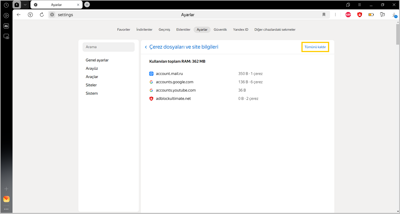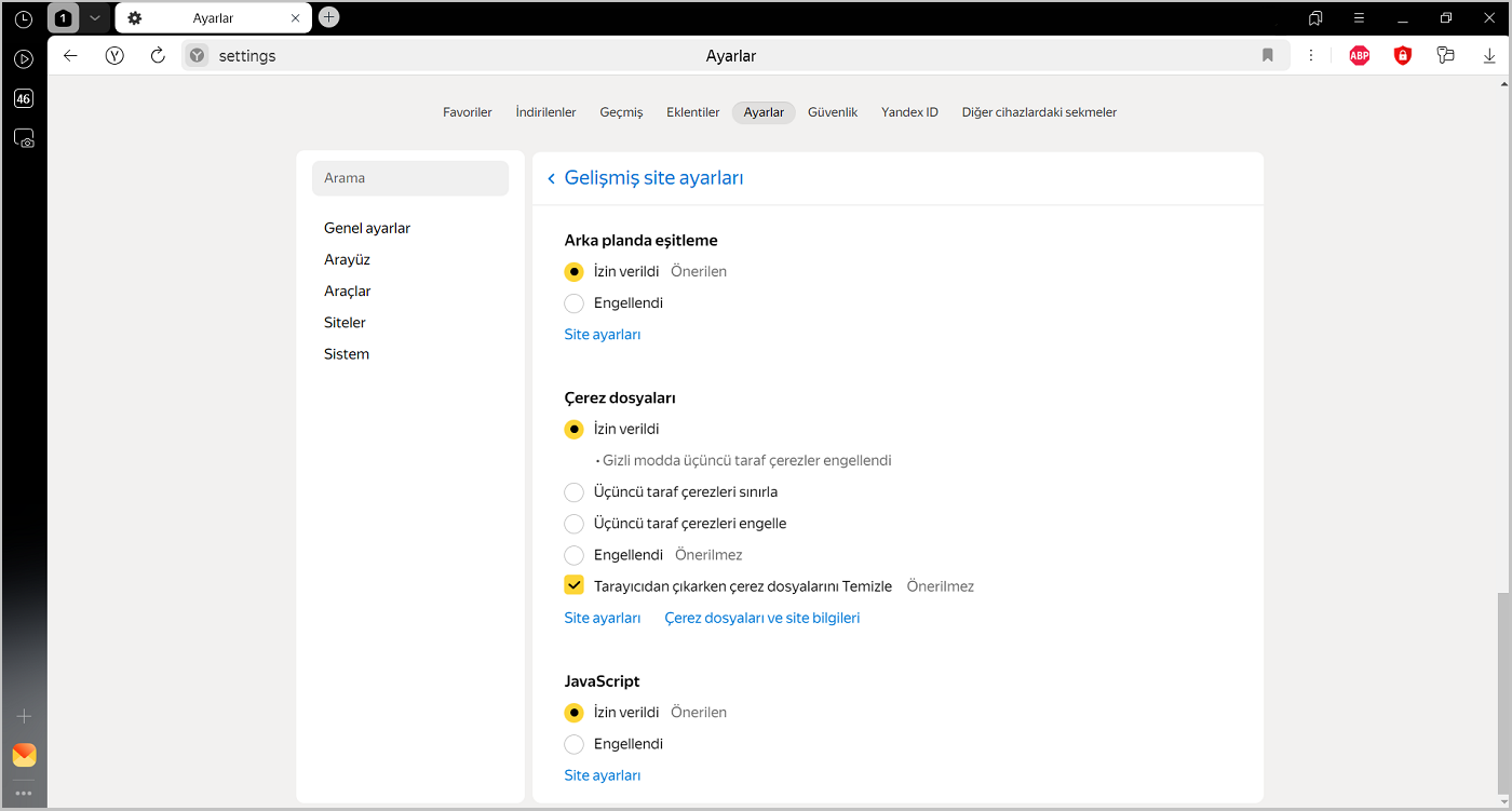 Yandex Browser ayarlarında çerez dosyaları için istisnalar belirleyebilirsiniz.