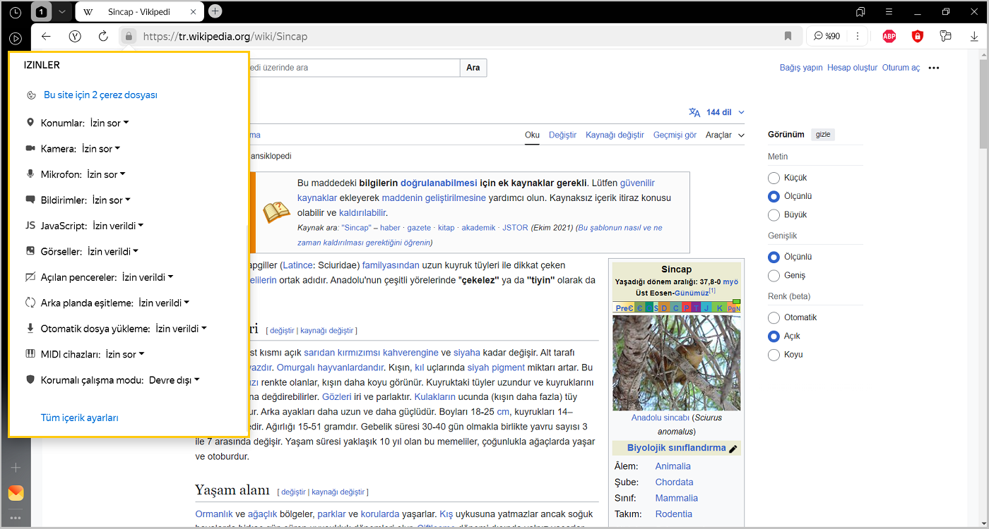 Varsayılan olarak tüm sitelerin çerezleri kaydetmesine izin verilir. Çerez dosyaların kaydedilmesini engellediyseniz, buna izin verin.