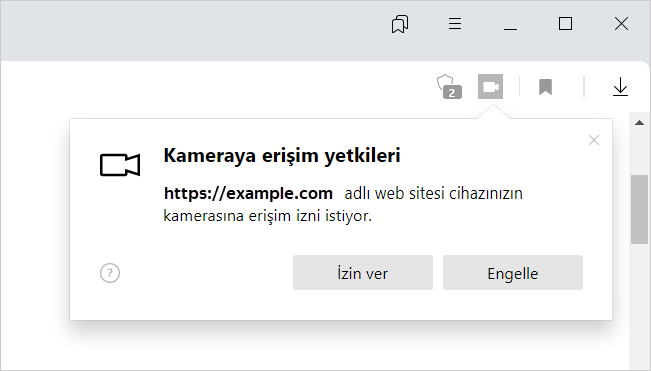 simgesi görüntülenir. Kameraya erişim yasağı, ilgili site için her zaman geçerli olacaktır. Kameraya otomatik erişim bir HTTPS sitesi için her zaman etkindir; HTTP sitesi içinse tek oturum için etkin kalır.