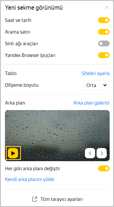 Beyaz arka plan seçilemez. Yandex Browser öğelerinin (bağlantı metinleri, widget'lar, buton adları gibi) herhangi bir arka planda kolayca görülebilmesi için bu gereklidir.