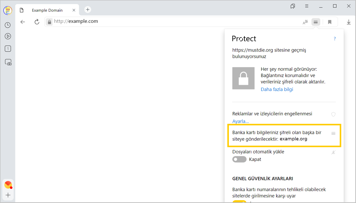 | Banka kartı numarasını **** güvenli veri şifrelemesi kullanmayan example.com sitesinde girmek üzeresiniz. Ödeme bilgileriniz internet dolandırıcılarının eline geçebilir. | Yandex ilgili siteyi şüpheli olarak algıladı veya ödeme işlemi sırasında bu site gerekli güvenlik seviyesine sahip olmayan HTTP bağlantısını kullanıyor. Ödemeyi iptal edin, aksi takdirde ödeme bilgileriniz dolandırıcıların eline geçebilir. |