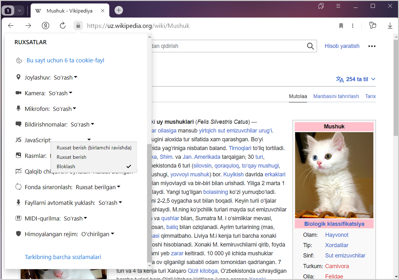 Sukut bo‘yicha, JavaScript’ni qo‘llab-quvvatlash yoqilgan.