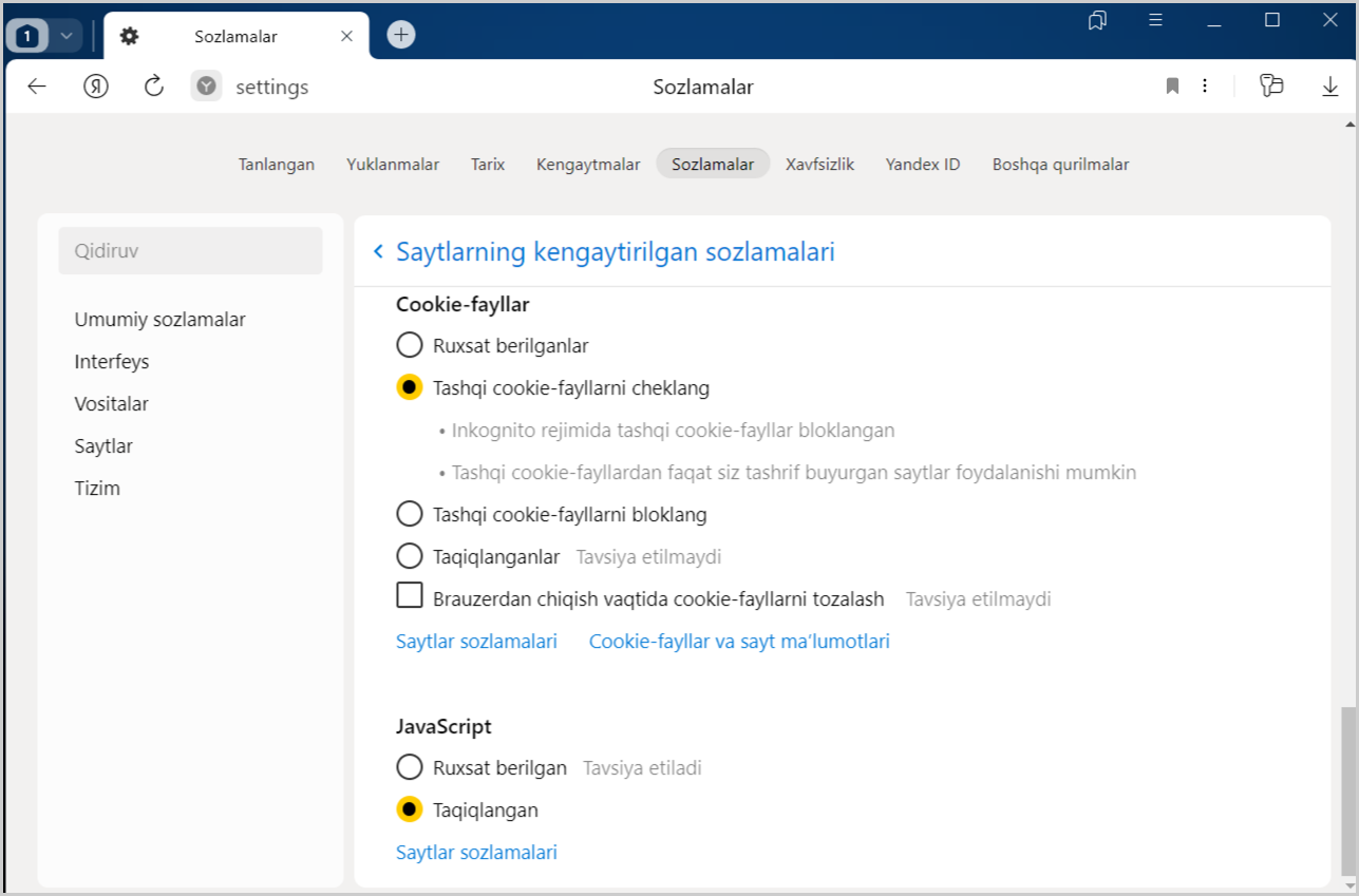 JavaScript’ni qo‘llab-quvvatlashni o‘chirish