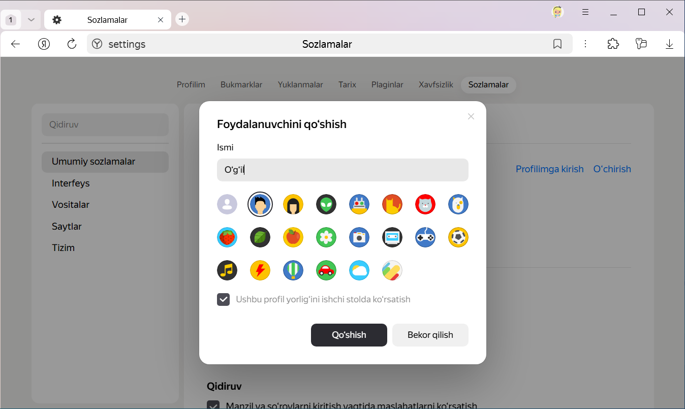 Bir marta bosish orqali Brauzerni yangi profil bilan ishga tushirish uchun Ish stolida bu profil yorlig‘ini yaratish parametrini yoqing.