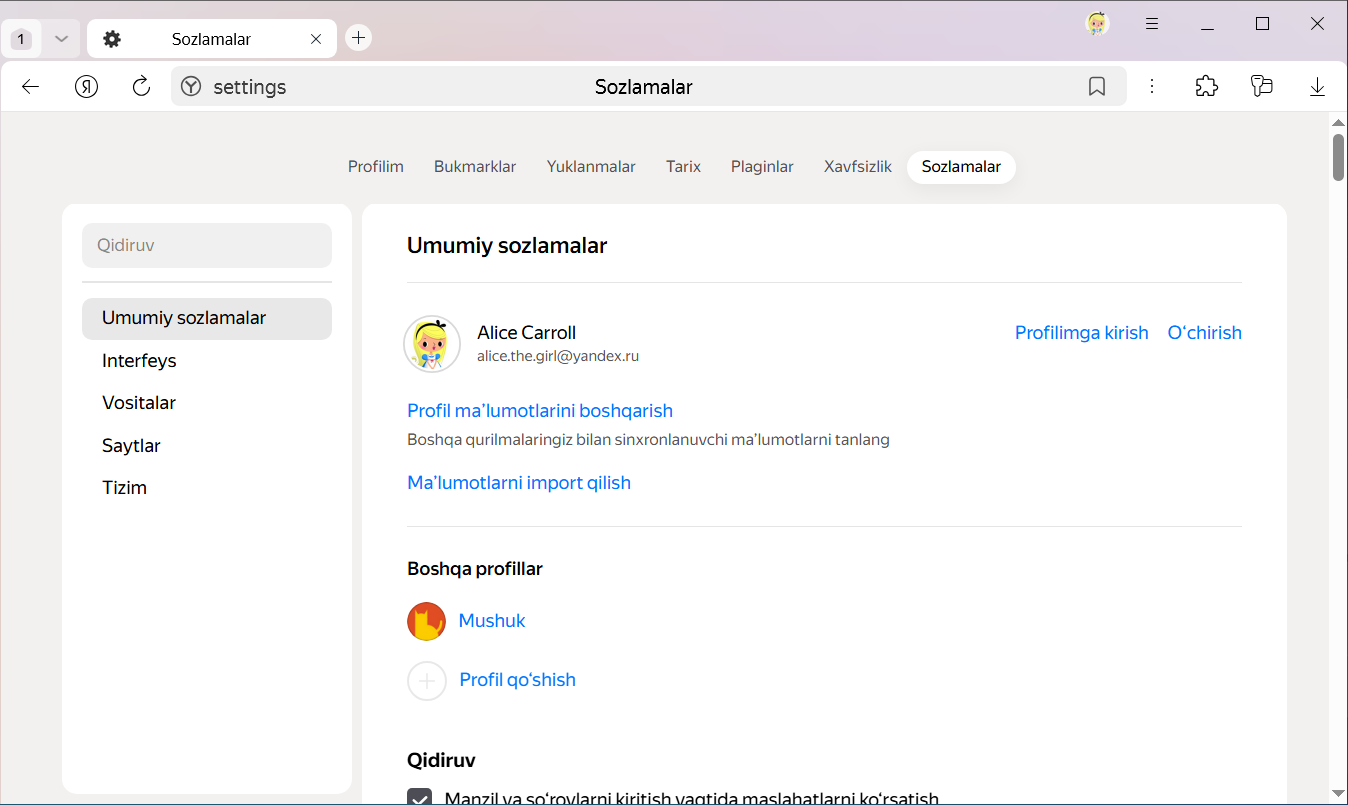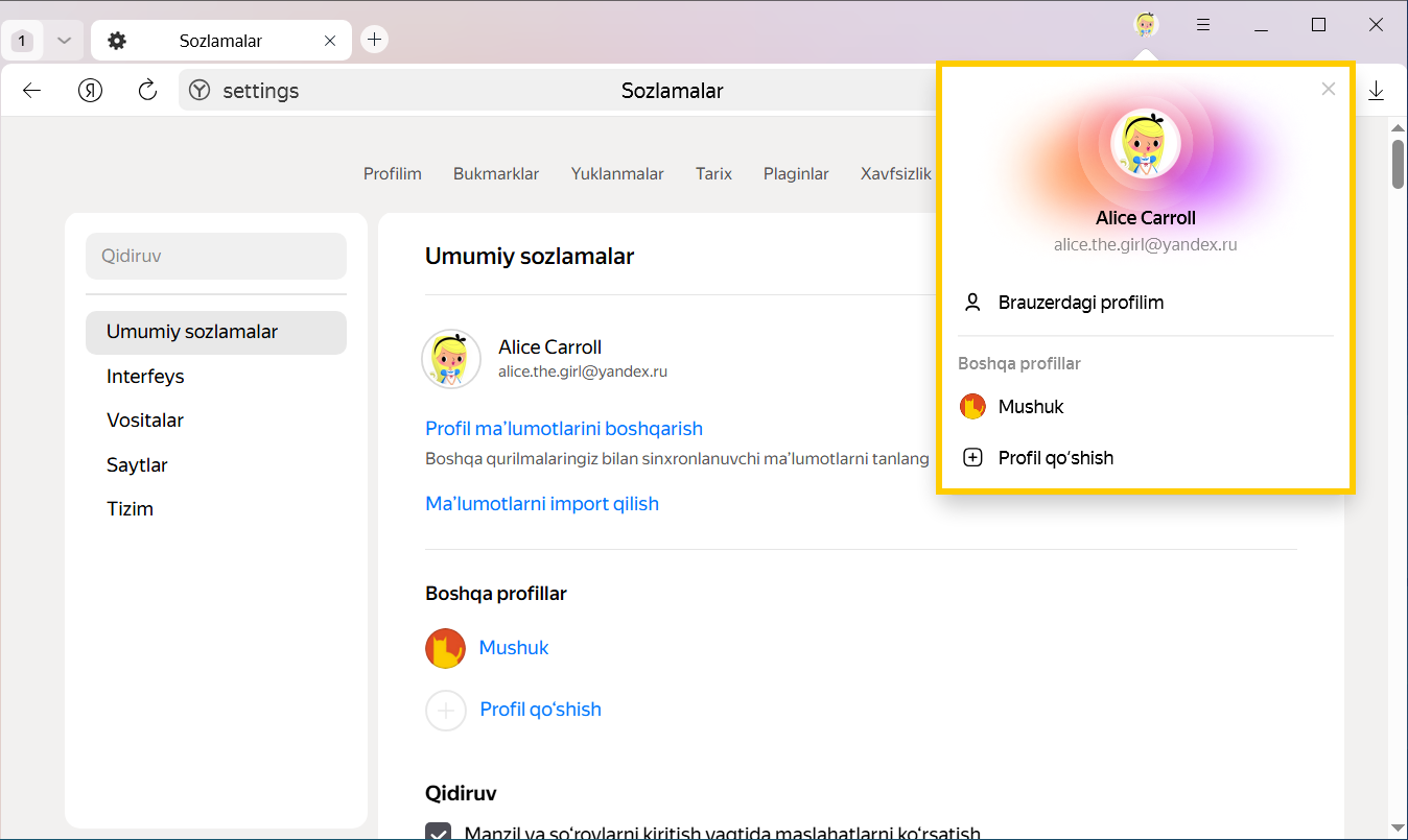 Tanlangan profil portreti bilan yangi Brauzer oynasi yaratiladi. Brauzer profillarini sozlamalarda ko‘rishingiz mumkin: