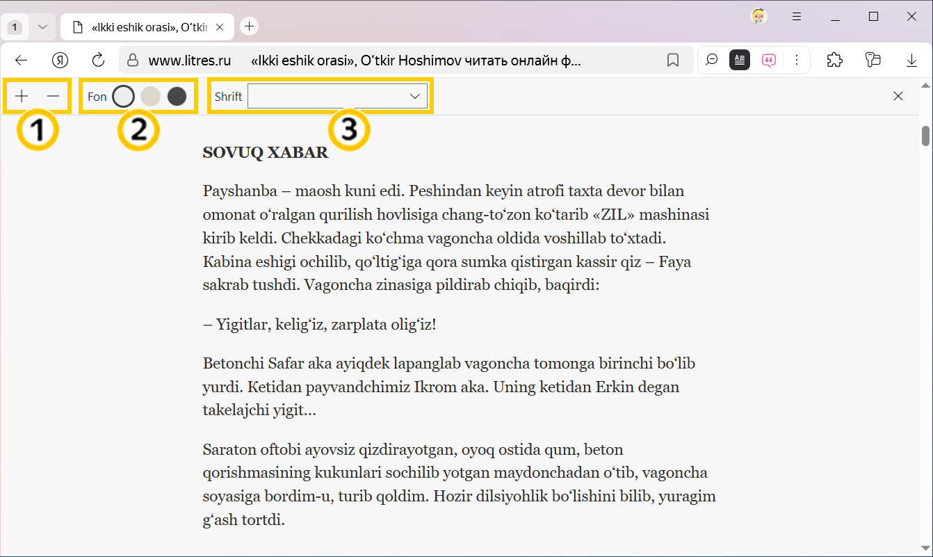 Matn uchun biroz joy boʻshatish uchun ekranning yuqori paneli Yandex Brauzer olib tashlanishi mumkin. Buni amalga oshirish uchun F11 tugmasini bosish orqali to‘liq ekran rejimiga o‘ting. To‘liq ekran rejimidan chiqish uchun F11 tugmasini takroran bosing.
