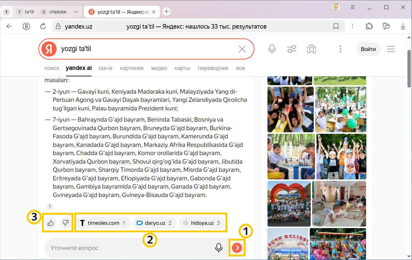 Yandex qidiruvida savolni istalgan shaklda — xayolingizga kelgan shaklda bering. Tavsif qanchalik batafsil boʻlsa, javob shunchalik sifatli boʻladi.