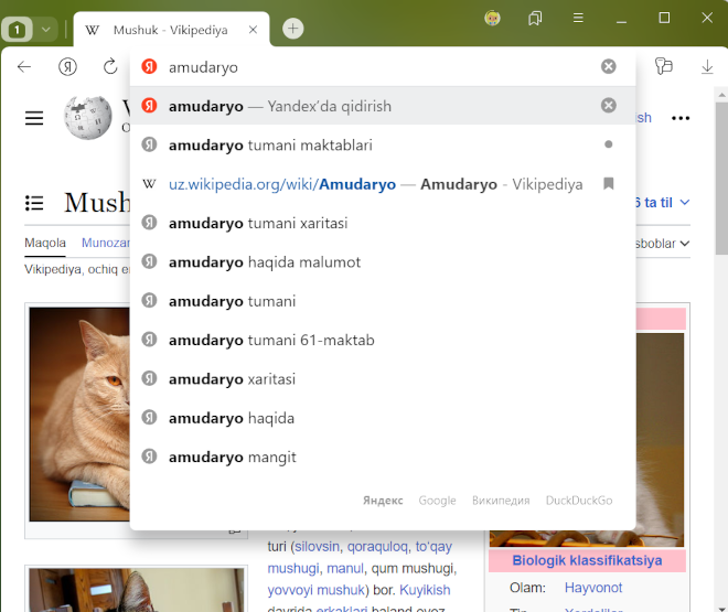 Brauzer kiritilayotgan qidiruv jumlasining tilini avtomatik almashtira oladi. Agar u bunday qilmasa, → Sozlamalar → Vositalar → Sahifa ichidan qidirish tugmasini bosing va Hech narsa topilmasa, terilgan soʻrovni boshqa joylashuvdan qidirish parametri yoqilganini tekshiring.
