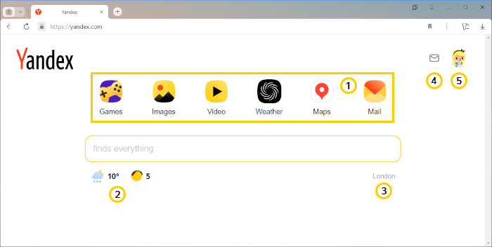 On the Yandex home page, you can see various elements. They make it easy to find information online and give you quick access to your favorite Yandex services.