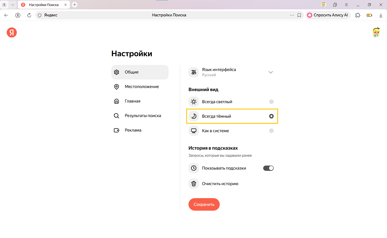 - В разделе Общие → Внешний вид выберите Всегда тёмный.