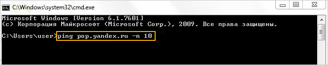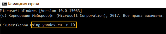 2. Введите в окне команду ping <адрес сайта> -n 10 и нажмите Enter.