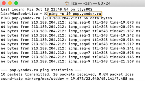 2. В открывшемся окне введите ping -с 10 <адрес сайта> и нажмите Enter.