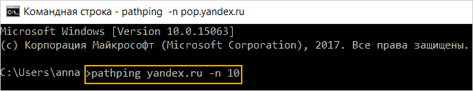 2. Введите в окне команду pathping <адрес сайта> -n 10 и нажмите Enter.