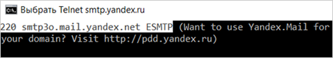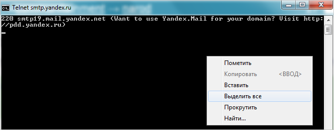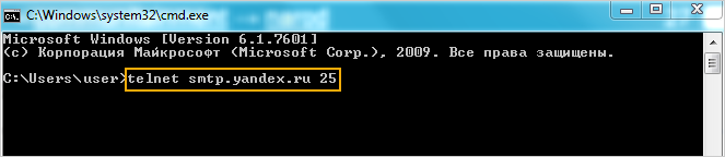 2. В открывшемся окне введите telnet <адрес сайта> 25 и нажмите Enter.