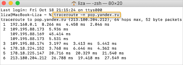 2. В открывшемся окне введите traceroute -n <адрес сайта> и нажмите Enter.