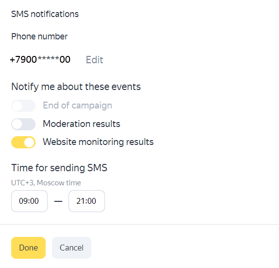 To enable SMS notifications, go to the campaign settings page under Advanced settings → Notifications → SMS Notifications → Notify me about these events and enable About website monitoring results. You can also choose the period of time when you want to receive notifications.