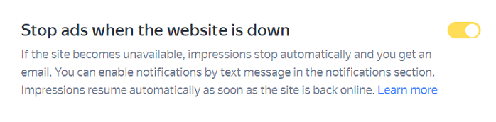 Yandex Direct now offers a site monitoring function to notify you of any problems with your site's availability. It keeps track of your site's availability by requesting your main page and automatically suspends ad impressions in order to avoid wasting your advertising budget. Impressions resume automatically once the site becomes available.