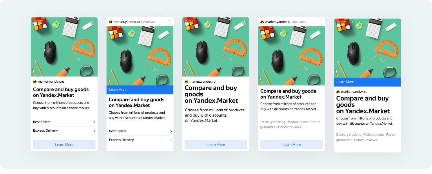 The Yandex Advertising Network uses Smart Design, a machine learning-based technology that automatically collects ads with different extensions for each impression.